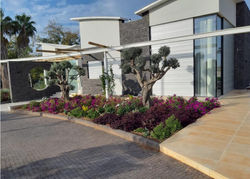 האחורי של הבית ,עוצב באבני בזלת ודיכונדרה כסופה המשתרעת בין האבנים .אלמון הודי נשתל לצד הפרגולות הרבות המקיפות את איזור המגורים.